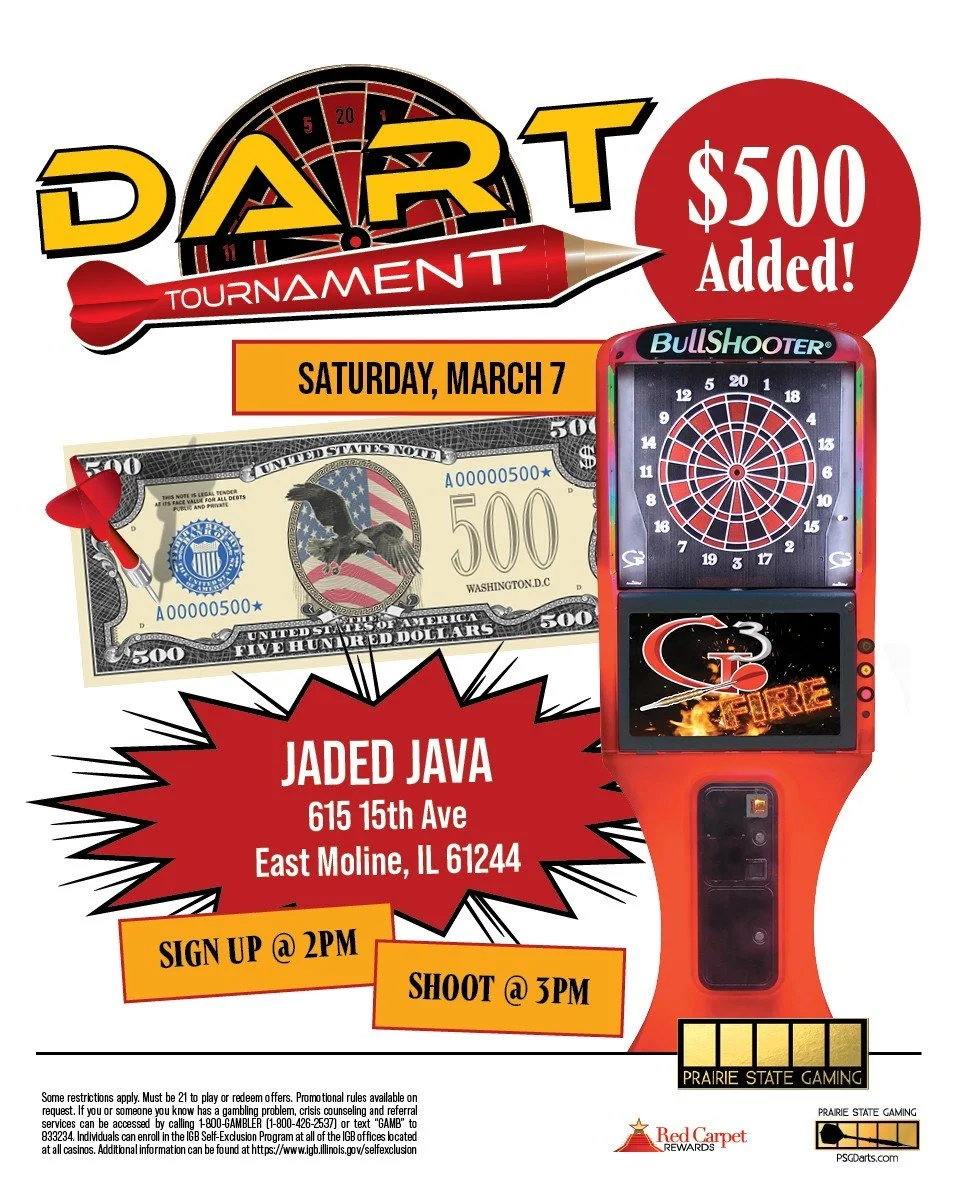 $500 added tourney, March 7th at Jaded Java! Sign up at 2, shoot at 3.